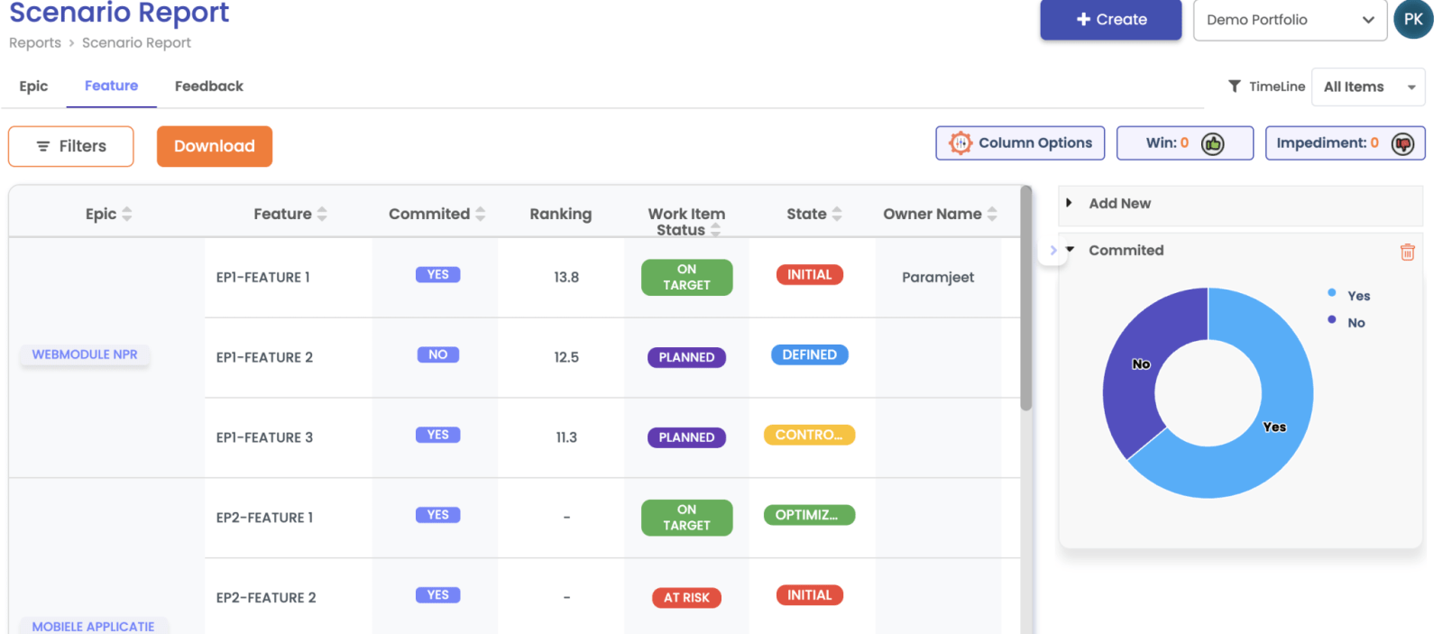 Het voortgangsrapport kan worden aangepast door widgets toe te voegen aan standaard of aangepaste velden en ongewenste widgets te verwijderen uit de widgetsectie. Een veld kan worden ingeschakeld voor widget door Portefeuille beheren -> Aangepast veld -> Beschikbaar voor widget (als Ja) te volgen.