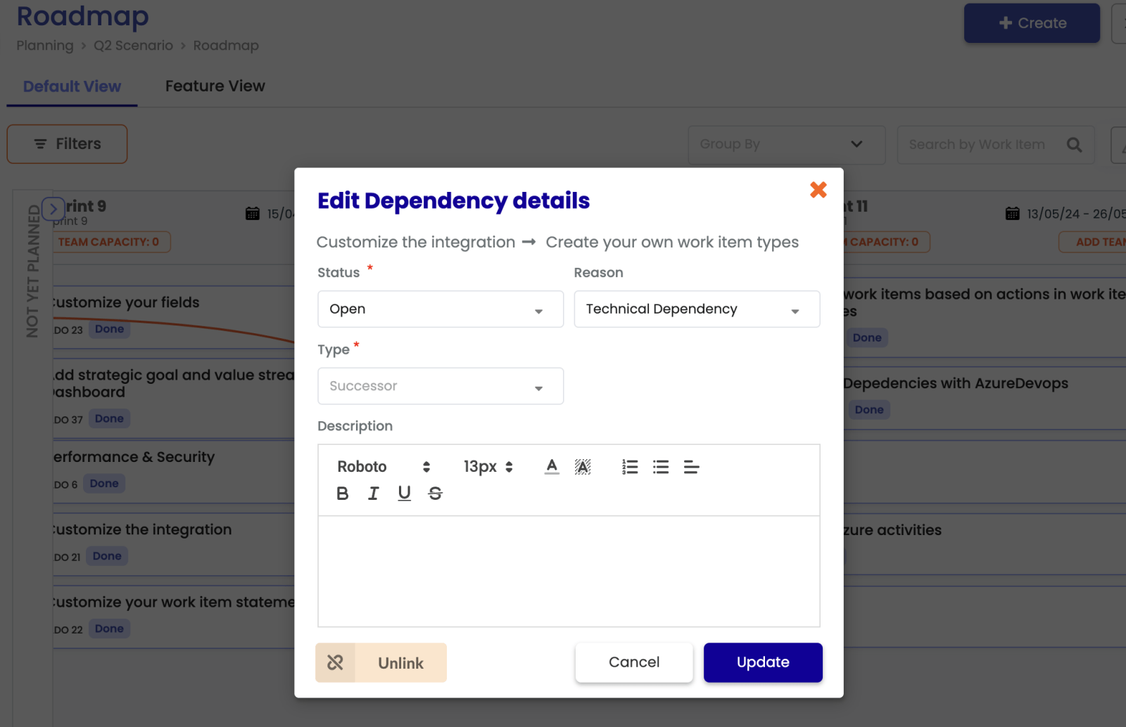 De afhankelijkheden kunnen ook worden verwijderd uit de portfoliotool als deze nog niet zijn gesynchroniseerd met ADO. Als je een afhankelijkheid aanmaakt in het scenario en niet publiceert, blijft de optie voor het verwijderen van koppelingen ingeschakeld om de afhankelijkheid te verwijderen. Maar nadat de afhankelijkheid met ADO is gesynchroniseerd, kun je deze niet meer uit de portfoliotool verwijderen.