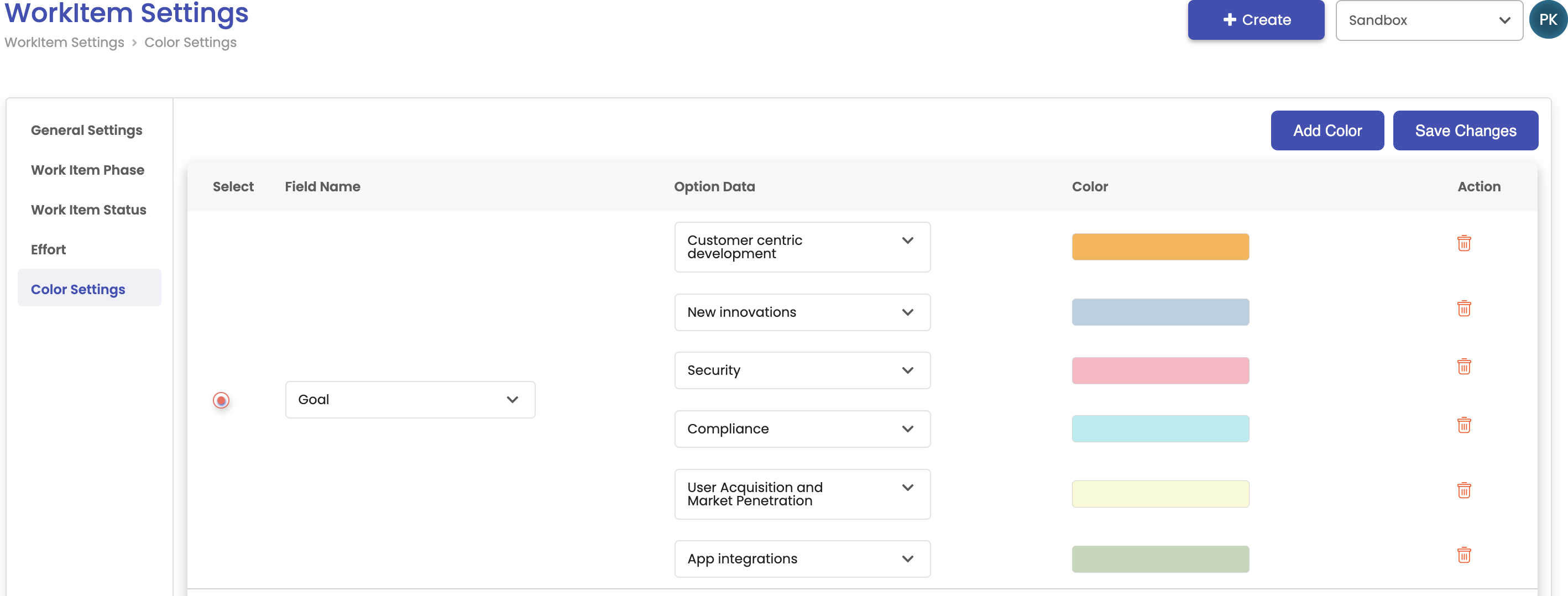 • Customizable Parameters: Define rules for assigning colors to work items, such as goals, status, value stream, or other key attributes.
